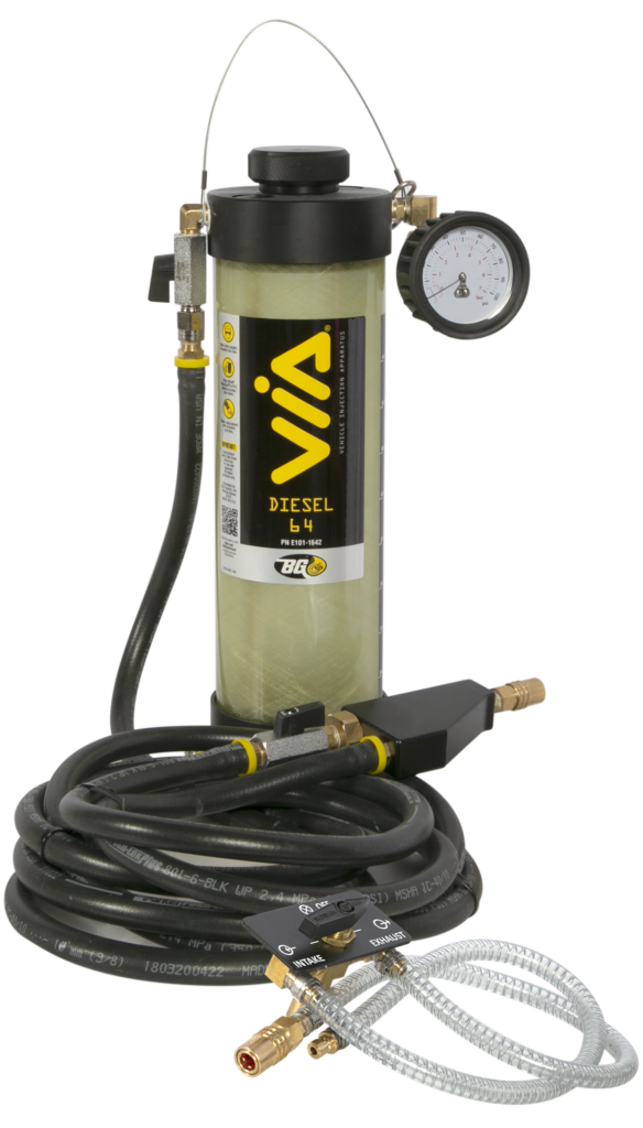 The BG Diesel EGR System Service is a two-part cleaning process, using the BG 64 Diesel VIA® supply tool to install BG Diesel EGR System Cleaner and BG Diesel EGR System Rinse. For best results, add BG 245 Premium Diesel Fuel System Cleaner to the fuel tank.