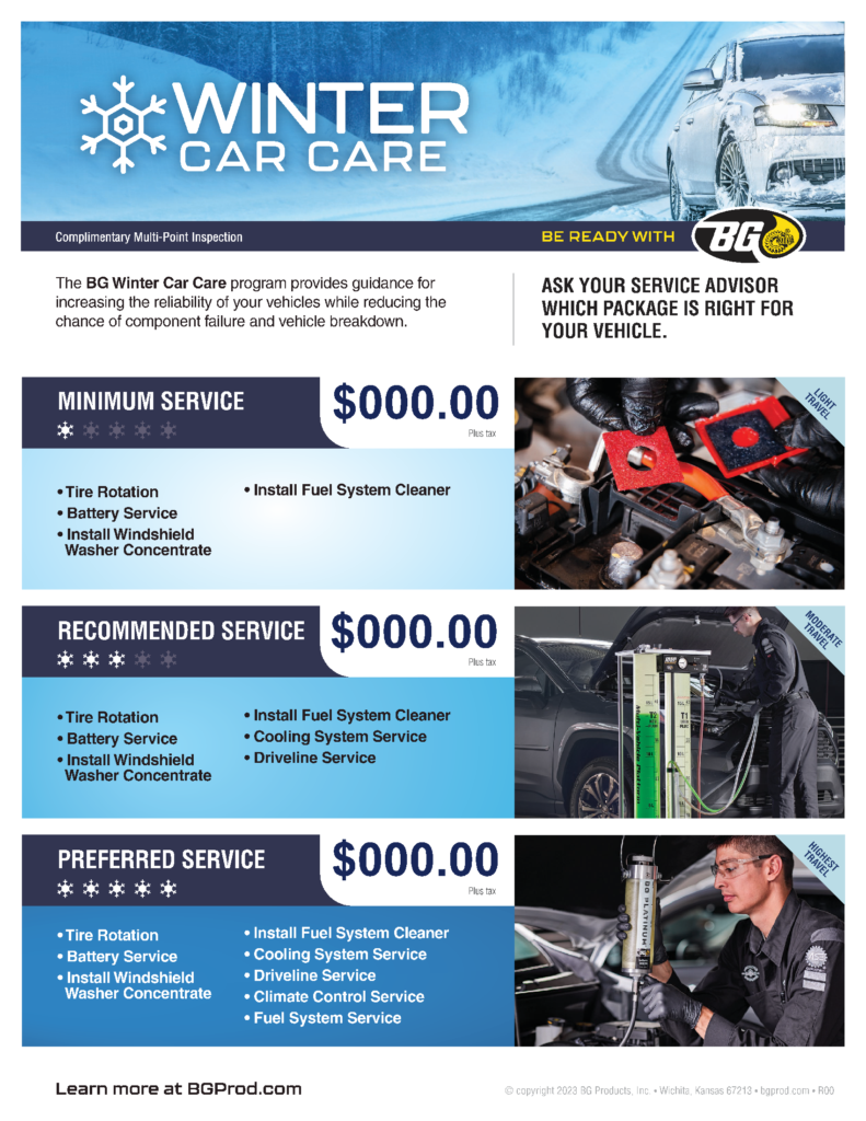 Contact your BG Rep to tailor a Winter Car Care program that works for your shop.